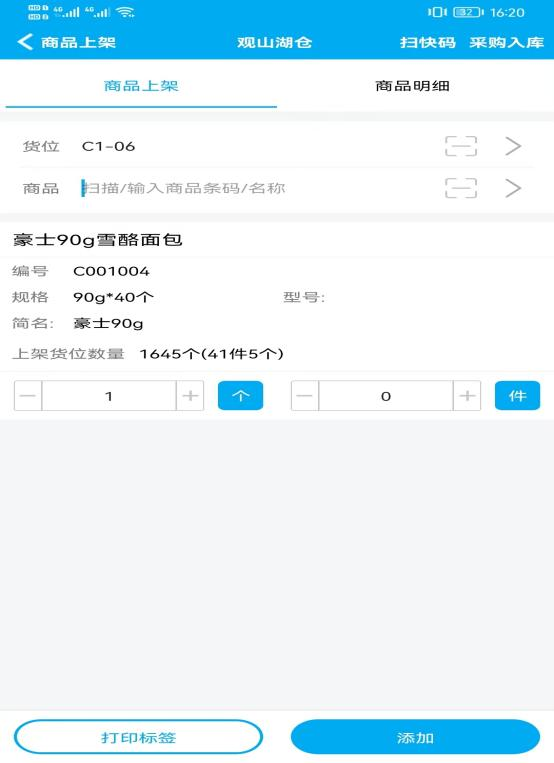 通過管家婆做單對接到物聯(lián)通倉儲WMS系統(tǒng),采用手持PDA設(shè)備,進行存貨上架,明確貨品在倉庫的所在位置以及庫存數(shù)量。